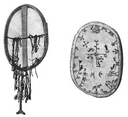 Till begagnande vid sina ceremonier ha de en trumma, gjord av en stor, urhålkad trästock ock lik dem, som begagnas vid krigshären. De överdraga endast den ena, övre ändan av den med ett skinn, på vilket överallt utefter kanterna äro ritade allehanda slags fyrfota djur, fåglar ock fiskar; på mitten avmåla de sin gud, på vilken de så lägga en groda eller något annat föremål av mässing. — — — Med en därtill avsedd hammare slå de så på trumman med täta slag. Detta redskap användes för trenne ändamål: till att utrannsaka det som rör jakt ock offer ock fjärran ting.