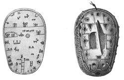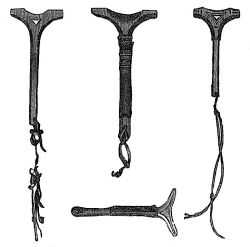 Til denne Runebomme haver han 2de Hamre, giort af Renhorn, som han kalder ziaarve vetzier; med den ene banker han idelig paa Runebommen, naar han noget vil forrette, tilmed haver han af Messing giort som en liden indhul Decsel[48] med [en Messingring oventil[49], som han kalder palm. Denne sætter han paa Runebommen, som han viste her for Retten, og løftede[50] Runebommen op og ned med sin Haand, vrier og holder den af og til og imedens banker med Hammeren, og siger han at [ved Messingdecselen faar han at vide, om det eller det er sandt elles ei[51], [bekiendte ydermere, at naar han spiller paa Runebommen for nogen og Decselen danser imod Solen, da har den en slem Lykke, han spiller for, men kommer den saa langt ned, at han staar ved en af dem, under den sidste Streg i den 5te Rad, da er Gud vred paa den, han spiller for, og maa den samme bede Gud meget, før Decselen vil gaa tilbage igien, saa Gud lader ham se, at han er et syndigt Menniske. Men danser Decselen ret om med Solen, da har den en god Lykke, han spiller for.[52]