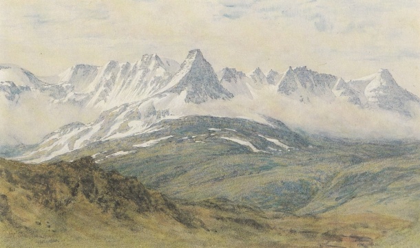 Fra Gejtlandet eller endnu bedre fra Kalmanstunge hinsides Hvitå, hvor man er tilstrækkelig fjærnet til at kunne få en uhindret oversigt, har man en højst ejendommelig og fængslende udsigt til den skønne jøkelgruppe, der indtager højlandet øst for Borgefjorden. Af Eriksjøklen længst i nordøst ses kun dens hvide snehætte, da det stejle jøkelfjæld til dels er skjult af foranliggende højder; tæt op til denne ligger Langjøklen (Lángjökull), der strækker sig bag om denne i uoverskuelig længde fra nordøst til sydvest, og hvis uhyre overflade kun for øjet viser sig som to lange aldeles jævne snebølger, hvortil en tredje, ved nogle mørkere tinder derfra adskilt jøkelhøjde slutter sig; jøklens enkelte partier har forskellige navne, således kaldes, som allerede anført, dens sydvestlige mellem Eriksjøkel og Ok liggende del Gejtlandsjøklen (Geitlandsjökull)[65]. Vest for Gejtlandsjøklen kommer Ok, den regelmæssigste af dem alle, en aldeles halvkugleformet eller skålformig snehætte, der dækker den øverste del af et bredt, jævnt skrånende fjæld. Foran hele denne gruppe ligger lavere brunlige fjælde, til hvilke den blændende glans, hvormed jøklerne i klart vejr stråler, danner den smukkeste modsætning.