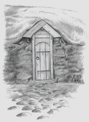Billedtekst: Erik den Rødes gård – Indgangen til Erik den Rødes rekonstruerede gård i Haukadalur i det nordvestlige Island.