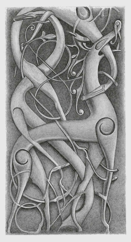 Revisjon per 13. feb. 2013 kl. 12:21 av Carsten (diskusjon | bidrag) (:'''Nordboernes gamle tro.''' 36. Illustration: clm :Copyright: © Carsten Lyngdrup Madsen, 2011 :Billedtekst: ''Portalen til Urnes stavkirke – Hjorten Eiktyrnir mellem grenene på verdenstræet Yggdrasil. Hjorten angribes af slanger, måske Nidhug. ...)