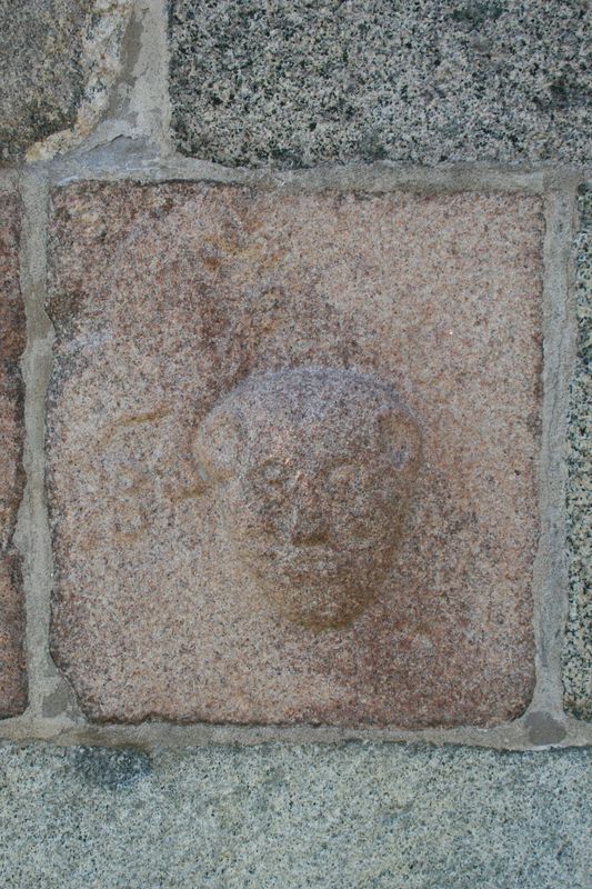 Romansk Granitrelief. Malle Kirke, Himmerland, Danmark. Ansigtet forestiller muligvis evangelisten Markus, idet der til venstre for hovedet anes et løverelief