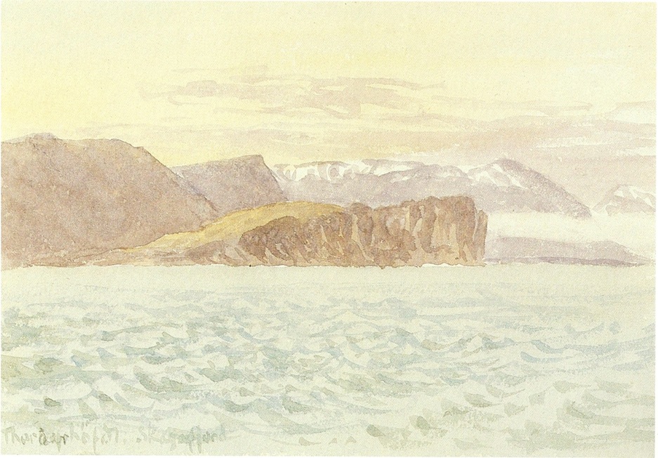 Þórðarhöfði i Skagafjord. Illustration af W.G. Collingwood, (1854-1932). Kilde: Fegurð Íslands og fornir sögustaðir