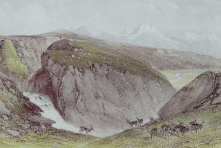 Mosfellsheiði. Illustration af A. E. F. Mayer, (1805-1890). Kilde: Íslandsmyndir Mayers 1836