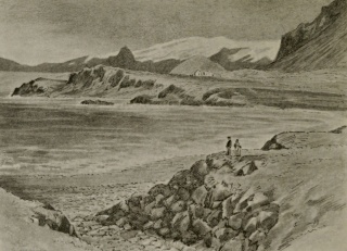 Bjarnarshöfn. Illustration af W.G. Collingwood, (1854-1932). Kilde: A Pilgrimage to the Saga-Steads of Iceland, 1899