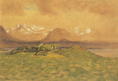 (utvivlsomt Frodåhede) til »under Hraun«, hvor Spå-Gils boede, for at søge råd hos denne. Nu findes ingen gård Hraun her i egnen, men den oven nærnte gård Hraunland er den, der på grund af sit navn og sin beliggenhed snarest kan antages at være den i sagaen omtalte. — Vest for Knör ligger gårdene Kamb (Kambr); den fra Eb. bekendte Bjørn Bredevigskæmpe antages at have bot på Store Kamb (Lille Kamb er nu i øde). Gården står umiddelbart under fjældene ved foden af en lav derfra nedskrånende ryg. Oven for Kamb ligger et skard (Kambsskarð) op i fjældene; langs dette går en, nu sjælden benyttet vej, der forbinder denne gård med den nord for liggende gård Frodå; i det vejen fra heden farer ned gennem skardet, bøjer den af umiddelbart ned mod tunet på Store Kamb, så at fremstillingen i Eb. (s. 90), hvorledes Snorre gode ved nedridningen fra heden overrasker Bjørn arbejdende i tunet, viser sig nøjagtig svarende til forholdene her. Hedevejen kaldes i Eb. Kambshede (Kambsheiðr). — Vest for Kamb laber den lille Gravarå (Grafará); vestlig ved denne ås udløb vises to tomter, kaldet »irske« tomter, hvorfra Irerne i tidligere tid skal have handlet. — Fra nu af indsnævres kystlandet igen og højner sig umærkelig; snart falder kysten med en lodret klippeskrænt af mod søen, og fra højlandet løber nær ved hinanden flere smååer og bække ned til havet og danner alle, hvor de styrter ned fra skrænten, smukke fosser. Snefjældsjøklen viser sig som en hvælvet, noget tilbageliggende og, på grund af fremstående knuder, noget ujævn hætte, hvis neden for liggende sneløse parti går umiddelbart i ét med halvøens fjældkæde, og hvorfra en lavastrøm ses at have væltet sig ned imod syd. Foran jøklen står det mindre, nøgne, spidst-kegleformige fjæld Stapafell, og neden for dette skyder et grønligt næs sig frem, hvorpå fiskerlejet Stapen (Stapi) står. Den stejle kystskrænt ud mod havet, umiddelbart før man kommer til Stapen, — med rugende mågearter på klippehylderne — bærer navnet Sölvahamar. Denne egns landnamsmand boede først på Brenning (Brenníngr), senere på Sölvahamar, fordi han mente dér at kunne være andre mere til nytte (Ldn. s. 82 — 83). Overensstemmende hermed vises hans hustomter på Sölvahamar på begge sider af vejen. Hans første bolig Brenning skal i følge sognebeskrivelsen have ligget lidt længere nede; i A. M. nævnes Brenning i Arnarstape land som et sted, hvor gamle bygningslævninger fandtes[8]. — Selve Stapen eller, som navnet nøjagtigere lyder, Arnarstape (Arnarstapi — efter en uden for kysten fritstående klippe) er nu kun en almindelig fiskerplads, ikke i nogen henseende forskellig fra de øvrige omkring Snefjældsjøklen; fælles for dem alle er den yderligste fattigdom og trang, bevirket ved det i de senere tider her højst usikre og, som det synes, stedse aftagende fiskeri. Oprindelig var Arnarstape en hovedgård (ÞK., BSnf.), hvoraf de forskellige fiskerhuse har udviklet sig. Efter gården bærer det betydelige kgl. jordegods i Snf. navnet »Arnarstape ombud«, i følge GhM. I, 457, fordi godsets første kgl. forvaltere havde deres bopæl her. — Tidligere dreves fra Snefjældsnæsset det måske vigtigste fiskeri på hele Island; — syd for jøklen var fisketiden især om foråret, nord for jøklen også hele vinteren igennem.