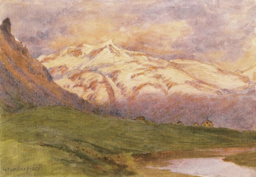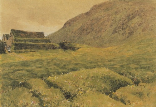 Hinsides Vadilshøvde med tilhørende højdedrag kommer igen en lille dal, hvori gården Örlygsstad (Örlygsstaðir) ligger. I følge Eb. solgtes denne gård af Torolv til Ulvars broder Örlyg, der ligeledes var Torbrandssønnernes frigivne; da Ulvar og Arnkel efter Örlygs død tog al dennes ejendom i besiddelse, foragedes end mere Torbrandssønnernes forbitrelse. Efter Ulvars død måtte Arnkel selv drive bægge disse gårde foruden sin egen, da ingen fæster af frygt for Torbrandssønnerne turde overtage dem; en vinternat, da Arnkel var beskæftiget med at flytte hø hjem fra Örlygsstad, overfaldes han her af Snorre gode og Torbrandssønnerne og falder efter en heltemodig modstand i høstaksindhegningen[62]. Hans trælle derimod viste en næsten idiotisk sløvhed eller forfærdelse, en af dem, Ofejg, blev så forfærdet, at han løb til fjælds og styrtede sig i den efter ham benævnte foss. — Den sidst nævnte lille dal gennemstrømmes af Örlygsstadaå (Örlygsstaðaá)[63]; omtrent lige over for Örlygsstad, hinsides åen, har gården Hella (Eb. s. 119) stået. (I A. M. udtales, at, efter hvad man mener, skal der fordum have stået en gård kaldet Hella, hvor der nu er stekk fra Örlygsstad, men som antoges ikke at have været bebygget, siden Örlygsstad bebyggedes.) Neden for Hella skulde i følge Eb. sumpen Glæsiskelda findes, hvori troldtyren fra Alvtafjord, i hvilken Torolvs djævelske natur for sidste gang kom til udbrud, forsvandt, således som senere nærmere vil blive omtalt. Neden for det holt, hvorpå gården har stået, findes i engene syd for fjorden mange mosehuller og dyndpytter, hvoraf især et nærmest Hella er farligt for kreaturerne, dette, antager man, er Glæsiskelda.