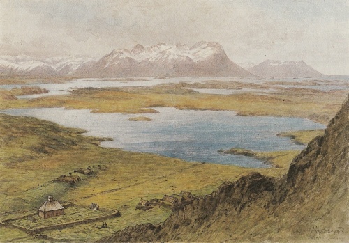 Påfaldende er det at se så gamle og pålidelige kilder som Ldn. og Eb. udtale sig på en så sagnagtig måde om domkredsens benyttelse, da dog både brugen af en domkreds som den dommerne omgivende skranke kan antages at have vedvaret, så længe de gamle retsformer bevaredes, og på den anden side en sådan dømmen til ofring i domkredsen og henretten sammesteds må synes uforenelig med oldtidens love og samfundstilstande. — Den beskrivelse, der således i sagaliteraturen er givet af domkredsen på Torsnæs ting med tilhørende blótsten, har imidlertid bevirket, at dette tingsted længe har tiltrukket sig almindelig opmærksomhed, så meget mere som adskillige tomter fra ældre tid findes bevarede her. Tingstedet ligger, hvad der også passer til kildernes angivelse, i den nordøstlige del af Torsnæs, og efter den fordums tingslette fører en her beliggende gård navnet Tingvold (Þíngvellir). På den nordøstligste del af næsset skærer en lang, smal vig Næsvåg (Nesvogr) sig ind[47]. Lidt sydligere end dennes munding går en lille klippehøjde ved navn Tingvoldborg (Þíngvallaborg) ud mod søen; neden under (ɔ: syd for) dette holt begynder fladt og sumpigt land, der strækker sig hen imod gården Tingvold. Denne ligger lige ved bunden, men dog på nordsiden af en smal, lille våg Tingvoldvåg (Þingvallavogr), og tunet strækker sig som en lang grønlig strimmel langs den nordlige og sydlige side af vågen, kun afbrudt på en kort strækning i jordbunden. Gudbr. Vigfussön har sikkert ret, når han[48] antager, at det er denne gård, der menes i Eb. s. 12, hvor der — efter at tingflytningen er omtalt — fortælles, at Torsten torskabit lod bygge gården Helgafell, hvorhen han selv flyttede, og derpå fortsættes: »han lod også bygge en gård dér i næsset i nærheden af, hvor tinget havde været, den gård lod han også meget omhyggelig opføre og gav den siden til sin frænde Torsten surt, som derefter boede dér.« Han forudsætter nemlig, at der efter ordene »havde været« (ɔ: var bleven) mangler ordet sat eller flyttet. Dette kan heller næppe være anderledes; ti uden en sådan tilføjelse måtte fortællingen gælde Hovstad, men denne var jo allerede tidligere opført (af Torolv Mostrarskegg, og utvivlsomt bebot af sønnen Torsten Torskabit indtil dennes flytning til Helgafell). Tingvold antages for oprindelig at være opført i Helgafells land; dog kan det vel være, at gården ikke har været bebygget bestandig siden dens første opførelse, eller at den som en art hjåleje er bleven regnet umiddelbart med til hovedgården, i Helgafells landemærkefortegnelse fra c. 1250 findes den således ikke nævnt. Torsten surt, der er bekendt for sin kalenderforbedring (han indførte den for den islandske kalender ejendommelige indskudsuge »sommerøgningen«, der hvert 7de eller 6te år føjedes til det sædvanlige år), nævnes oftere i kilderne, men uden at hans bolig nærmere angives; i Laxd. siges i almindelighed, at han boede på Torsnæs, og sagaen fortæller (s. 56), at han druknede, da han var i færd med bortflytningen fra Torsnæs, hvor Torsten Torskabits sønner var blevne ham for mægtig. I det til Tingvold gård hørende tun findes, så vel syd som nord for vågen, en mængde tomter, øjensynlig rester af de gamle tingboder.