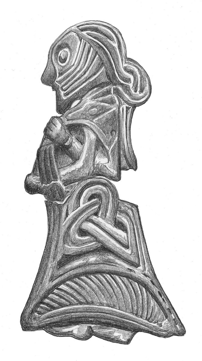 - Billedtekst: Sølvsmykke fra Tissø, 900-tallet.Valkyrie. Bemærk den treløkkede knude på kjolen. Den kaldes en valknude og er et udbredt hedensk symbol, som bl.a. findes på flere runesten.