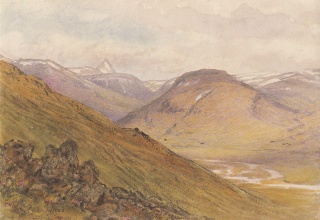 Horft af Sauðafelli inn til Grafarmúla. Illustration af W.G. Collingwood, (1854-1932). Kilde: Fegurð Íslands og fornir sögustaðir