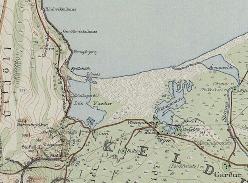 De sidst omtalte gårde og andre stedsnavne ligge alle i den egenlige Aksarfjordssvejt, en bygd, der mod øst begrænses af et græs- og vandrigt højland Aksarfjordshede, hvorfra mod nordvest udgår et fjæld, Núpsfjall, hvis vestlige affald Aksargnup (Axar(g)núpr)[7], således bliver bygdens nordøstlige begrænsning. Mod syd er Aksarfjordssvejten ved en fem mile bred hedestrækning skilt fra den såkaldte Fjældbygd eller Fjældene (Föll), en række gårde, af hvilke de to sydligste kun i gejstlig henseende høre til dette syssel, i verdslig derimod til Norder-Mule syssel. De øvrige er derimod både i henseende til hrepp og sogn forbundne med Aksarfjord. Disse gårde overgås næppe af nogen på Island i henseende til besiddelsernes vidtstrakthed. Mödrudals — den sydligste gårds — land når helt op under Jøkelsås kilder. Fra Vatnajøkel øst for Jøkelså strækker sig nord efter fjælde og fjældheder, der brede sig over store partier af denne del af Island, i det de skille, dels mellem »Fjældbygden« og Norder-Mule syssel, dels, længre mod nord, mellem Aksarfjordssvejten og de nordøstligere bygder. Dette udstrakte højland er næsten forfærdende øde. Rejser man tværs over det (ad for resten gode veje), ser man til alle sider, så langt øjet rækker, sorte banker, fjælde eller flader af grus og sand, uden et strå; mange pas og dale passeres; kortet er for disse øde egnes vedkommende ikke meget pålideligt. I den vestlige udkant af dette øde land ligge nu »Fjæld«-gårdene i en indbyrdes afstand af 2 — 3 mil og omtrent 1 mil fra Jøkelså. Deres beliggenhed er højst ejendommelig; gården ses omgivet af et grønt tun, men synes for resten henkastet midt i ørkenen. Forholdene her er dog ikke så fortvivlede, som de synes; flyvesandsstrækningerne skjule mange græspletter, kviste og småbuske findes rundt om — ja for får er græsgangene her endog så ypperlige, at de intetsteds på Island blive federe. Således bliver det særsyn forståeligt, at flere af »Fjæld«-gårdene hører til de mest velbyggede og nettest udstyrede i hele landet[8]. Heden og fjældene øst for Fjældbygden har forskellige navne. I Grettes saga, hvor sagaen beretter om, at Grette en sommer holdt til på Mödrudalshede og forskellige andre steder, også stundum på Reykjahede (se oven for s. 180), er formodenlig den hele strækning benævnt Mödrudalshede (Möðrudalsheiðr), således som tilfældet er i Þorst. hv. (s. 40); nu er Mödrudalshede dog kun betegnelsen for de til Østlandet hørende ubygder sydvest for Mödrudalsgården. At Grette ikke let vekselsvis kan have været på Reykjahede og fjældene øst for Fjæld-bygden, følger allerede af afstanden og den mellemliggende Jøkelså. At optrinet mellem Tore i Gard og ham næppe er foregået på Reykjahede, som sagaen vil, synes som tidligere anført at fremgå af den beskrivelse sagaen giver af heden. På fjældhederne mellem Tingø og Mule sysler passer beskrivelsen ikke heller. Derimod har man i Aksarfjardarhede — som står i umiddelbar forbindelse med de sidstnævnte hedestrækninger — en græsrig hede med sætere, med sumpe og moradser, der ligger nogenlunde nær ved Tores gård, og i en egn, hvor Grette efter al sandsynlighed i længre tid har haft sit tilhold. At traditionen knytter hans navn til en klippe øst for Jøkelså sydlig i Aksarfjordsbygden er tidligere (s. 182, anm. 3) nævnt; men et langt interessantere minde om ham findes nordlig i bygden, i Aksarnup, hvor et såkaldt Grettesbæle (Grettisbæli ɔ: Grettestilhold) endnu er bevaret Aksarnup er, som det vil erindres, navnet på en fjældpynt, der fra det nordvestlige hjørne af Aksarfjordshede går ud mod fjorden. Mellem kysten og fjældet ligger et mosestrøg, hvorover vejen til bygden langs kysten nord efter fører. Den øverste del af fjældet består af stejl klippe, men derefter skråner fjældsiden dækket af sammenhængende stenskred (lausaurð) ned mod lavlandet. Midtvejs i nordsiden af denne af løse sten bestående skråning findes en tomt, til hvilken navnet Grettesbæle er knyttet. Tomten, der er opført af stenblokke, er godt og vel 5 al. lang, mindst 1½ al. bred og væggene henved 1½ al. høje; over tomtens ene ende er tre store stenblokke anbragte som overliggere og har øjensynlig gjort nytte som tag, den øvrige del af tomten kan da måske antages at have været dækket med vadmel, når det behøvedes. Her holdt Grette til en tid lang, fortælles der, og røvede fra de vejfarende, som han havde let ved at holde øje med fra sin bolig; tilsidst måtte vejen under »nupen« helt aflægges, og man måtte anlægge en anden, som i en bue fører over fjældet bag ved, og hvis spor endnu påvises. Da nu Grette ikke længer fik lejlighed til at plyndre, måtte han fortrække. »Bælet« er let at forsvare, og ingen kan hemmelig nærme sig dertil, da de løse stens raslen forråder enhver.