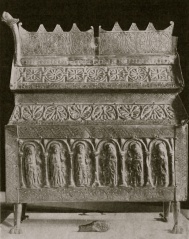 Relikskrin av trä med förgylld kopparbeklädnad. Överst vanligt sadeltak, därunder pulpettak åt fyra sidor. Från Eriksbergs kyrka, Västergötland, nu i Statens Hist. museum.