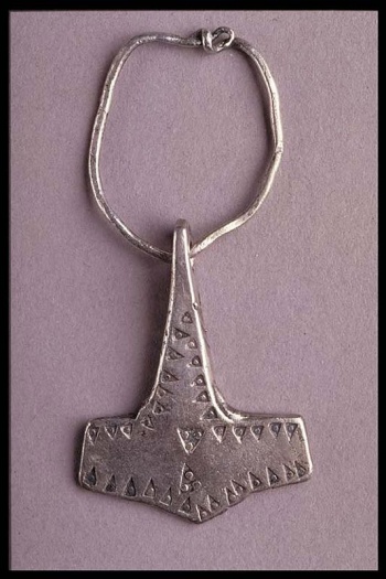 Bilde av torshammer laget av sølv, funnet i Gärsnäs säteri, Skåne.