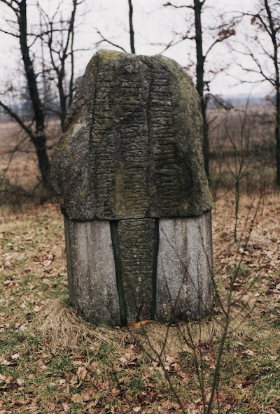 Stenen er engang blevet kløvet, men står igen på sin oprindelige plads.