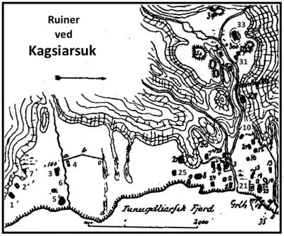I den Nord derfor liggende 3 Mil lange og smalle Arpagfikfjord findes endvidere 2 Ruingrupper, hvoraf den ene i alle Tilfælde er af en Gaard. I Kvannitfjorden findes en Gaardtomt og endelig i Tigsalikfjorden og dens nærmeste Omgivelser fire saadanne — den nordligste ved Grønlænderbopladsen Tigsaluk (61½° n. Br.). Af de 18 Ruingrupper var de 7 mer eller mindre omtalt tidligere af Læge Fanøe.