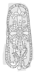 Þorstæinn le[t ræi]sa stæin þenna [æftiR] sik sialfan ok sun sinn Hæfni. VaR til Ænglands ungR drængR farinn, varð þa hæima at harmi dauðr. Guð hialpi sialu þæiRa. Bruni ok Sloði þæiR [rist]u stæin þenna.