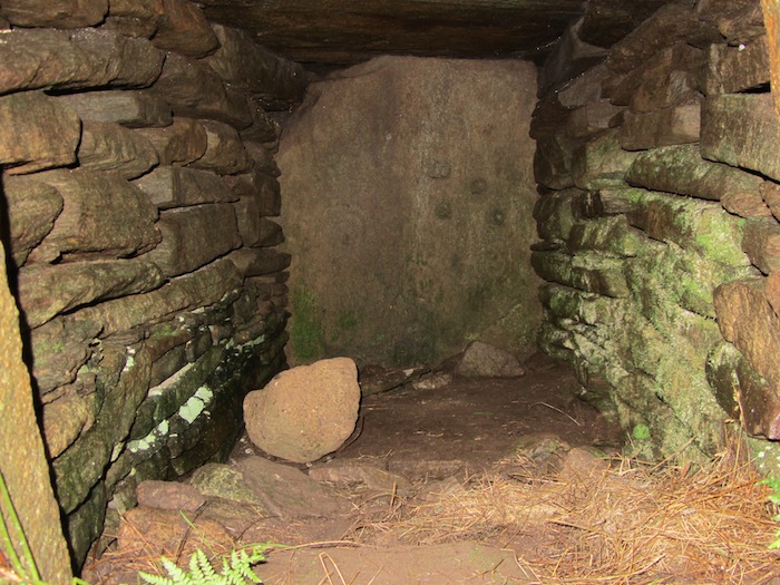 Det ene av Regehaugens to parallelle gravkammer med de berømte helleristninger. Bronsealdergravhaug på Rege i Sola kommune i Rogaland.