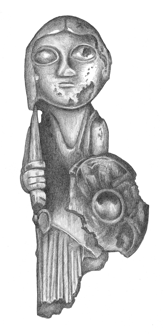 - Billedtekst: Sølvvalkyrie bevæbnet med sværd og skjold. Hårby, Fyn, begyndelsen af 800-tallet.