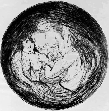 Den tiltalte svarede ikke, men var lige ved at nyse af Stolthed. Dagen igennem søgte han at gaa paa Fangst, men han kunde ikke faa Giftermaalet ud af Hovedet. Da han kom hjem om Aftenen, gjorde han sine Redskaber i Orden, og saa snart han var bleven færdig, gik han ud sammen med det første Mørke. De ventede ham som sædvanlig ikke ind, før de var kommen til Ro. Det blev Aften, og først sent hen hørte de ham komme ind. Det var, som om han ikke var alene; da han kom ind gennem Indgangshullet, kan det nok være, han havde begge Arme udstrakt bagud, for han kom slæbende med en gammel Jomfru, og idet han satte hende ind i Huset, sagde han, at nu var han kommen hjem med sin Kone.