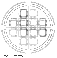 Jeg vil nu forslå en enklere tagkonstruktion end i de to hidtidige rekonstruktioner. De ydre skråstivere er altid placeret ud for en vægstolpe. Det betyder, at de to bjælker var sammenføjede, og at skråstiverne måske alene bar spærene. Stabilitet kunne opnås med de vandrette lægter i tagbeklædningen. De ydre skråstivere ved endevæggene har båret spær til valmen. Tagbeklædningen gik sandsynligvis helt ned til jorden, således at der var en godt isolerende dobbeltvæg i ca. 2m højde. Der var ikke tagudhæng. Taget var en selvbærende konstruktion. Spærene fungerer som teltstænger. Af vandrette bjælker i taget er der kun en firkantet ramme øverst oppe, hvor lyren også er. Vi kender ikke tagbeklædningen, men den enkleste har været stråtag. Det er også muligt at det har været spejlkløvede brædder. Brædderne har så ligget på klink og nået fra spær til spær. Hver af de seks vægge havde en dør. Se mit forslag til rekonstruktion af trelleborghuset (figur 27). Den kræver mindre træ og mindre arbejdskraft end de tidliger rekonstruktioner.