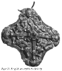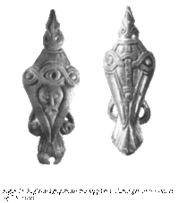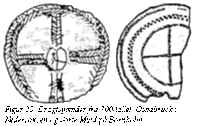 Slangen på forsiden er der en parallel til på amuletten (figur 36), som er fra samme tid og sted som mønterne. Amuletten er tydeligvis inspireret af hedenske amuletter som den, der er vist på figur 32 til højre. Her på figur 36 er det imidlertid den kristne himmelgudinde, der viser sig med fuglenæb og stærkt markerede øjenbryn. De ligearmede kors viser igen hele den åndelige verden, himlen. Jeg vil opfatte slangen på møntforsiden (figur 35) som et klæde, der ligger i Jomfru Marias hænder. Med dette klæde viser hun, at hun løfter de frelste op på sit skød i himlen. Det kan også besrives som et bånd, hvormed hun binder de frelste til hende. I kristne kirker ser man i middelalderen, at Himlen symboliseres ved Abrahams skød, hvor der hviler et klæde.