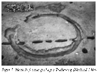 Figur 3 viser en hesteskoformet grube (Nørlunds nummer 121) anbragt ovenpå stolpehuller fra en af karrehusene. Det frengår af figuren, at der ikke ses noget stolpehul i bunden af gruben. Gruben må derfor må være gravet senere end karréhusets stolpehuller. I gruben har været et plankeværk formentlig til beskyttelse af et offersted. Der var tre andre hesteskoformede gruber på Trelleborg: (Nørlunds 117, 123 og 31) (figur 11). Uden for hver af disse hesteskoformede gruber fandtes der en brønd med rester af ofrede dyr og mennesker.