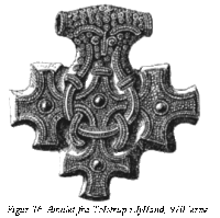 Det cirkelformede spænde på figur 34 fra Hornelund ved Ribe er fra ca år 1000. Det viser igen asetroens kosmologi. Korsarmene i cirkelkorset udgøres af fire dragehoveder, der repræsenterer jætterne, d.v.s. naturkræfterne. Jætterne kommer fra Udgård, de store vande og vældige kræfter i yderkredsen, markeret med slyng. Her findes Midgårdsormen. På smykket her er den kun markeret med et tyndt snoet bånd; men den er mere fremhævet på andre smykker. Jætterne er også skabende kræfter. De søger ind mod inderkredsen, der repræsenterer gudeverdenen, Asgård, men det er også dem, der ved Ragnarok, d.v.s. "gudernes fald" vil komme og udslette Asgård. De fire slangefigurer i kvadranterne må repræsentere åndelige kræfter, der breder sig overalt i himlen og også i menneskenes verden, Midgård. Smykket illustrerer faktisk Trelleborgs grundplan. Kostbare smykker med denne symbolik blev brugt i slutningen af vikingetiden omkring år 1000 i de hedenske høvdingekredse f.eks. på Gotland. Det er som om myten om Ragnarok fik øget opmærksomhed, da asetroen i 900-tallet blev truet af kristendommen.