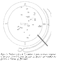 Nørlunds tegninger af området indenfor ringvolden viser andre stolpehuller og ildsteder som meget vel kan hidrøre fra huse fra fase1 eller 2. Se min tegning af de rester, der muligvis stammer fra de tidligste faser (figur 6). Desuden er næsten halvdelen af området mellem karréerne og ringvolden slet ikke udgravet. Ved en udgravning i 1979 er der undersøgt et ildsted i nordvestsiden af borgen op ad ringvolden (Adamsen 1979). Et hus her må også have tilhørt en tidlig fase 1 eller 2. Adamsen mente dog ikke at kunne påvise et hus her.