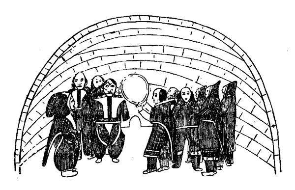 Dette Festhus var saa stort, at vi med Lethed kunde være treds Mennesker derinde. Det var en mægtig Snehal, bygget til Fester og Sammenkomster, af vældige Sneblokke. For at der selv midt paa Dagen kunde være lunt og hyggeligt derinde, havde man rejst to Sidefløje til, der paa en virkningsfuld Maade stod som Loger inde i det store Rum, hvor Festdeltagerne samledes. Begge Sidefløjene var beboede. I den ene sad en ung Moder paa en Sidebriks og puslede med to Smaabørn, der stadig gjorde Forsøg paa at rive hendes Sytøj fra hende. Hendes store Vægstenslampe spredte Lys og Varme ud i Rummet, og man kunde ikke lade være med at beundre den Hygge, der straalede ud fra de smukke, varme Rensskind, der dækkede Briksen. Polartorsk, Laks og tørret Kød var lagt hen i en Bunke paa Sidebriksen og angav, at der holdtes aabent Hus for enhver, der ønskede en Bid Mad. Den mosatte Sidefløj var ogsaa beboet og udstyret paa ganske samme Maade, men det Ægtepar, som ellers holdt til her, havde sluttet sig til Aftenens Kor, og de unge Piger, der havde paataget sig at passe Lampen, stod nu oppe paa Briksen som nysgærrige Tilskuere. Oppe i Hallens Hvælving var skaaret et Par Nischer ind i Sneblokkene, og her brændte smaa Spæklamper, der kastede et æventyrligt Lys ned over alle de Mænd og Kvinder, der skulde udgøre Koret. De var allerede opstillede i en Rundkreds om Forsangeren, der stod midt i Hallen med en mægtig Tromme i Haanden. Saa stor er denne Tamburin, at der ofte bruges hele Rensskind til Trommeskind. Trærammen, hvorpaa det udspændes, maa derfor være meget solid. Som Følge heraf faar Trommen, der holdes med venstre Haand, en meget betydelig Vægt. Intet Under derfor, at det kræver baade Kræfter og stor Træning at optræde med den, ofte hele Timer eller mere ad Gangen.