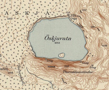 Udbrud af Udådehrauns-vulkanerne omtales flere gange i kilderne. Således er det næppe tvivlsomt, at der på de tre steder, hvor de islandske annaler fra middelalderen (Íslenzkir Annálar) omtale ild i Troldedyngerne (Trölladýngjur), sigtes til Dyngefjældene, eller, rettere sagt, til Udådehrauns-vulkanerne i almindelighed, da selve udbrudsstedet i disse, sjælden eller aldrig besøgte egne naturligvis ikke med nøjagtighed har kunnet angives [48]. Endnu et par udbrud fra »Troldedyngerne« i middelalderen nævnes hos senere annalforfattere; derefter spiller dette navn ingen rolle, indtil for kort tid siden et voldsomt udbrud fra Dyngefjældene har henledet den almindelige opmærksomhed på disse til den underjordiske ilds hærgninger hjemfaldne egne og givet anledning til deres nærmere undersøgelse. I slutningen af året 1874 og begyndelsen af det følgende år antydede i den nordøstlige del af landet jordskælv og drøn, at et vulkansk udbrud var i gærde; derefter så man fra Myvatnsbygden i begyndelsen af januar 1875 en betydelig ild i syd, indtil udbruddet i slutningen af februar døde hen. Af nogle bønder fra Myvatnsegnen, som på denne tid besøgte den nye vulkan, erfaredes det, at udbruddene havde fundet sted fra Askja i Dyngefjældene. Derefter hvilede vulkanen til den 29de marts, da et storartet pimpstensudbrud bedækkede de øst for vulkanen liggende egne af Islands østland med et flere tommer tykt askelag; ja det finere pimpstensstøv førtes endog af vinden til Norge og Sverig, hvor det den følgende dag regnede ned. Endnu samme år besøgtes vulkanen af Englænderen lord Watts [49]; men først det følgende år foretoges en videnskabelig undersøgelse af disse egne ved professor Johnstrup [50]. Han fandt Askja meget unøjagtig aflagt på Bj. Gunnlaugssons kort. Det er en noget nær 1 kvadratmil stor, omtrent kredsformig slette i Dyngefjældene, af hvilke den er omgivet, således at der kun mod øst er et gab, gennem hvilket lavastrømme i en ældre tid har fundet udvej. [Dog må navnet Askja vel snarest udstrækkes til dal-kedelen med de den omgivende fjældvægge.] Desuden findes der mod nordvest en kløft, nu benævnt »Jónsskarð«, gennem hvilken adgang med heste til nød kan finde sted. Den store omgivende lavaørken (Udådehraun), der længst mod nord ligger omtrent 1500 f. over havets overflade, hæver sig efterhånden til en højde af over 3000 f.; Askja selv ligger 3700 f. over havet, Dyngefjældene 4500 f., medens snelinjen på Island omtrent kan sættes til 2500 f., og det indre højland for større strækningers vedkommende ellers næppe hæver sig mere end til 2000 f. Dalbunden i Askja er tid efter anden bleven hævet betydelig ved en stor mængde lavastrømme, der fra talrige kratere langs siderne af de dalen indesluttende fjældvægge så vel som fra dalens midte har udgydt sig i denne kedel. Også i fjældenes ydre skråninger findes talrige kratere, hvorfra lavastrømme, der har bidraget til dannelsen af Udådehraun, har udgydt sig. — De nye kratere findes alle i den sydøstlige del af Askja. Nordligst af disse ligger et enkelt krater, hvorfra det voldsomme pimpstensudbrud har fundet sted. Dette store krater var i somren 1876 opfyldt af vanddampe, der brød frem fra bunden med en lyd, som når et lokomotiv blæses ud. Umiddelbart syd for dette krater var der foregået en betydelig indsænkning med lodret afbrudte klippevægge mod nordvest; midt i denne indsænkning fandtes en sø med lunket vand. Endnu sydligere, i den inderste del af Askjas sydøstlige hjørne findes alle de andre kratere, så nær ved hinanden, at mange have en fælles tragt. Fra alle disse udstrømmede en uhyre mængde vanddampe, der indhyllede omgivelserne i tæt tåge; fra kraterne udgik store kløfter, gennem hvilke det her dannede vand fandt afløb til søen. Trods de storartede omvæltninger, som har fundet sted her ved udbruddene 1875, antages dog ikke hele indsænkningen eller alle kraterne at være opståede ved denne lejlighed, skønt intet bestemt lader sig udsige om deres alder.