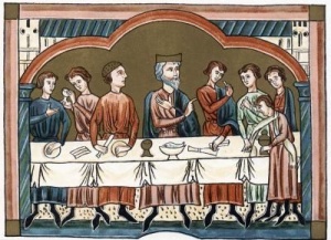 [[Fil:Omkring bordet.jpg|thumb|300px|<center>'''Omkring bordet'''<br>''Middelaldermotiv'' </center>]] | [[Fil:Omkring bordet.jpg|thumb|300px|<center>'''Omkring bordet'''<br>''Middelaldermotiv'' </center>]] | ||