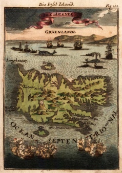 2-3. Björn Ketilsön var paa Jemteland, indtil Kjallak Jarl döde. Han ægtede Gjaflöge, Jarlens Datter, og tog derefter östen fra, over Kjölen[340], först til Trondhjem, og derpaa til Landets sydlige Egne, samt bemægtigede sig alle de Eiendomme, som havde hört hans Fader til, men bortjog alle de Forvaltere, som Kong Harald havde sat derover. Kongen var österpaa i Vigen da han spurgte dette, og begav sig da nordpaa, over Oplandsveiene, til Trondhjem. Da han kom der, indkaldte han 8 Fylkers Indbyggere til et Thing, paa hvilket han landsforviste, Björn Ketilsön fra Norge, og erklærede ham for fredlös til Drab eller Fængsel, i hvor han end maatte træffes. Derefter udsendte Kongen Hög Höibrog og flere af sine Kæmper, for at slaae Björn ihjel, hvis de kunde træffe ham. Da Kongen kom, paa Sydreisen, Stad forbi, fik Björns Venner det at vide, og underrettede ham lönlig derom. Björn gik hastig ombord paa en Skude[341], som han eiede, med alle sine nærmeste Huusfolk og Underhavende, samt sit Lösöre, og tog Flugten sydpaa, langsmed Landet (indenskjærs), thi Vinteren var den Gang saa stræng, at han ikke saae sig istand til at holde ud paa rum Sö. Han kom saaledes til den Ö söndenfor Hördeland, som kaldes Moster[342], og modtoges der af en Mand, ved Navn Rolf, Sön af Örnolf Fiskreke. Björn var der hemmelig, Vinteren over, men Kongens Sendebud vendte tilbage, da de paa hans Vegne havde inddraget Björns Eiendomme og antaget Forvaltere derover. Rolf var en stor Hövding, tillige meget gavmild. Han forvarede et Gudehuus derpaa Öen, som var helliget til Thor, og var hans hengivneste Dyrker, samt kaldtes derfor Thorolf (d.e. Thor-Rolf). Han var en stor og stærk Mand, afsmukt Udseende, samt havde et stort Skjæg, hvorfor han blev kaldet Mostrarskjæg; ellers var han den yppersteMand paa Öen. Da Foraaret kom, overlod Thorolf Björn et godt Langskib, bemandet med raske Folk, og formaaede sin Sön Hallstein til at fölges med ham, hvorpaa de fore til de vestlige Lande, paa hin Side af Havet, for at besöge Björns Frænder. Da Kong Harald spurgte at Thorolf Mostrarskjæg havde huset den af ham landsforviste Björn Ketilsön, sendte Kongen ham det Budskab, at han burde drage bort af Landet, fra hvilket han skulde forvises, ligesom hans Ven Björn, med mindre han vilde begive sig til Kongen, og lade ham ene afgjöre deres hele Mellemværende. Dette skete 10 Vintre efter Ingolf Arnarsöns Bortreise, for först at beboe Island, hvilket hans Tog siden var blevet meget berömt, da Folk, som kom der fra Landet, sagde, at det udmærkede sig ved de gode Herligheder som det havde.