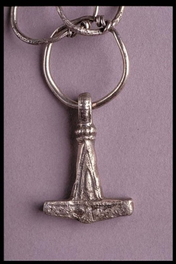 Torshammer hengende i kjede i sølv fra Pålstorp, Raussocken, Helsingborg kommune, Skåne, Sverige. Torshammeren tilhører en skatt som ble funnet av en gutt som gravde i jorden i 1870. Skatten inneholder 60 deler, blant annet kufiske mynter, biter av halskjeder, armringer, fingeringer, endestykke til hals- og arminger samt biter av smykker. [1]
