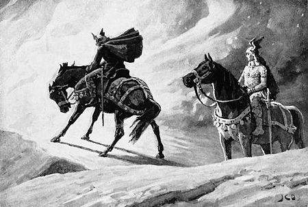 | − | De tillrustade nu sin färd med mycken omtanke, redo öfver fjäll och dalar till konung Budle och buro fram sitt ärende. Han upptog detta väl, om hon själf ej hade något däremot; ty han sade henne vara så stolt, att hon månde äga den man allena, som hon själf ville. Därpå redo de till Hlymdalen. Heimer mottag dem väl, och Gunnar sade sitt ärende. Heimer sade, att det berodde på hennes val, hvem hon skulle äga; sade hennes sal vara belägen kort därifrån och menade, att den allena månde hon vilja äga, som red öfver den brinnande elden, hvilken var slagen rundt om hennes sal. De funno salen och elden och | + | De tillrustade nu sin färd med mycken omtanke, redo öfver fjäll och dalar till konung Budle och buro fram sitt ärende. Han upptog detta väl, om hon själf ej hade något däremot; ty han sade henne vara så stolt, att hon månde äga den man allena, som hon själf ville. Därpå redo de till Hlymdalen. Heimer mottag dem väl, och Gunnar sade sitt ärende. Heimer sade, att det berodde på hennes val, hvem hon skulle äga; sade hennes sal vara belägen kort därifrån och menade, att den allena månde hon vilja äga, som red öfver den brinnande elden, hvilken var slagen rundt om hennes sal. De funno salen och elden och sågo borgen glänsande af guld, och eld brann utanomkring. Gunnar red Gote men Högne Hölkvir. Gunnar dref sin häst i elden, men han vek tillbaka. Sigurd sade: ”Hvi ryggar du tillbaka, Gunnar?” Han svarade: ”Icke vill hästen löpa öfver denna eld.” Han bad Sigurd låna sig Grane. ”Den står till din tjänst”, sade Sigurd. Gunnar red nu mot elden, men Grane ville icke gå fram. |