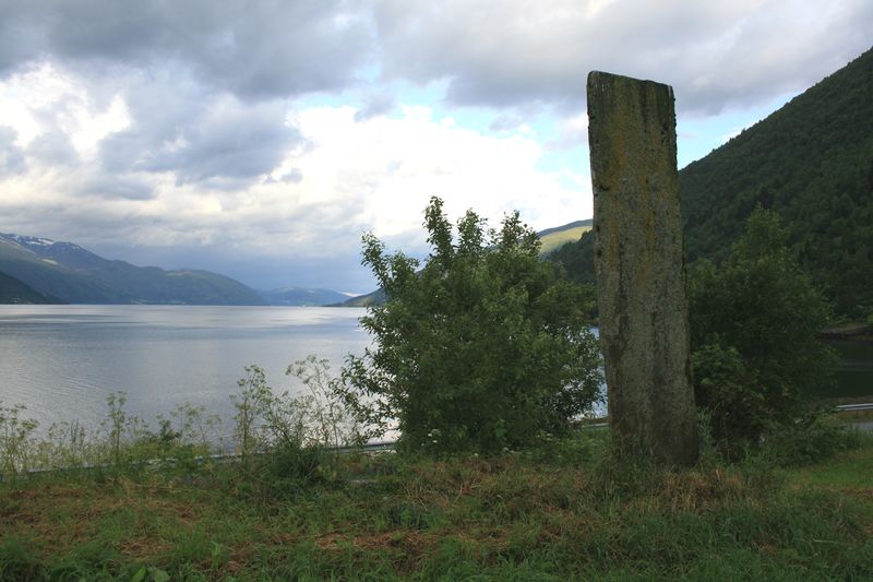 Bautasten. Stenen er efter sigende rejst over Kong Vermund, der sammen med 90 mænd blev indebrændt af Ragnvald Jarl (Harald Hårfagers Saga, kap. 12). Naustdal vest for Nordfjordeid, Sogn og Fjordane.