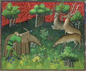 - ↑ Buen (ɔ: Laasbuen, Armbrøsten) var trang at spænde; den maatte sættes mod Jorden (foran Knæet) og holdes med Foden, medens man med Hænderne trak i Strengen. Han skød Hinden, mens den stod op ad et Træ (derved blev Sigtet tydeligere).