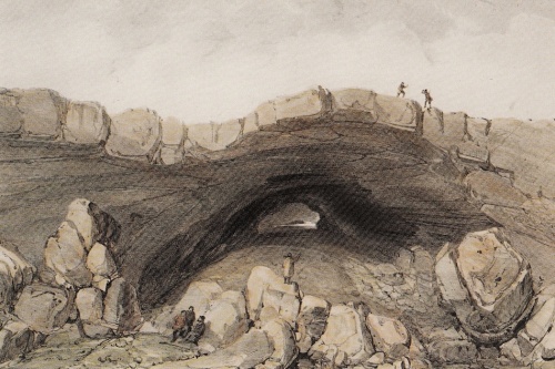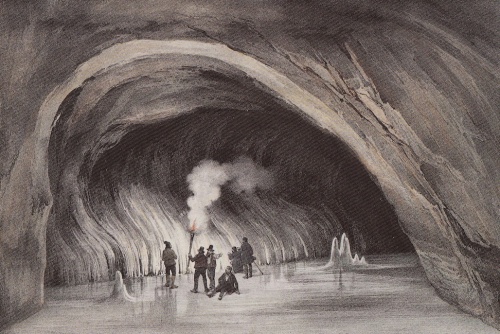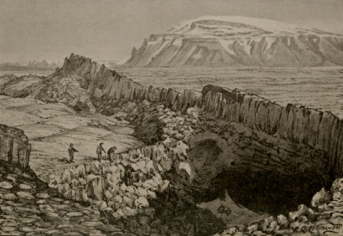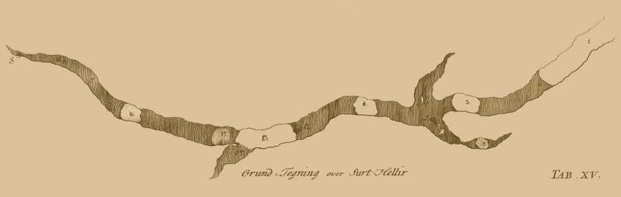 Om nogen egenlig gåen kan der kun på de færreste steder i denne være tale; Gulvet er nemlig besat med kantede (regelmæssig firkantede) stykker lavaklipper, mellem hvilke man ved hjælp af hænder og fødder må klatre og glide, så godt det lader sig gøre. I denne første del af hulen er der dog højt under loftet og tilstrækkelig lyst, man har heller ikke gjort mange skridt her, før lyset slår en i møde fra den indre del af hulen, og det viser sig, når man er kommen længere frem, at hulens loft her på en længere strækning (10—15 fv.) er aldeles indstyrtet, til bægge sider hæver sig de lodrette vægge, så det er umuligt gennem denne åbning at komme op af hulen. Det oven omtalte sagn beretter, at Hellismændene plejede at drive de røvede fåreflokke hen til randen af åbningen her og styrte fårene ned i hulen gennem denne, hvor der da stod folk rede til at tage imod de halvdøde får og fuldstændig slagte dem. Inden for denne åbning (eller gjå, som denne og de følgende af denne slags kaldes) begynder det både i historisk henseende interessanteste og mest storartede parti af hulen. Lofbet hvælver sig 20—30 al. højt, efterhånden som man kommer længere ind svagere og svagere belyst af lyset fra gjåen. En forunderlig regelmæssighed hersker her som overalt i hulen i væggenes bygning ; hraunlagene strækker sig aldeles parallelt, skilte ved fremstaaende lave striber, der hist og her kan benyttes som trappetrin, når man vil stige op til de herværende tværhuler, og som aldeles minder om et bindemiddel mellem i lag lagte masser, der har været udsat for tryk, medens det var ved at stivne. Fra den omtalte gjå kan man langs den højre væg af den jævnt skrånende hule følge en smal vandret løbende afsats og kommer da snart til den første tværhule. Straks ved indgangen til denne hersker et fuldstændigt mørke, og vil man trænge videre frem, må man være forsynet med lys eller fakler. Først møder en lille tilfrossen sø med vand over isen, hvorover man må vade; denne fylder den rundagtige indgang, fra hvilken en dybere og smallere hule strækker sig til højre; noget inde i denne, omtrent ved midten af den højre sidevæg, ses en dynge kreaturben, til dels kløvede for marvens skyld — det første, men ingenlunde det eneste vidnesbyrd om pålideligheden af beretningerne om, at denne hule har været et tilholdssted for fredløse. Benene ligger tæt inden for en del sammenstablede stenblokke, der måske kan have dannet et ildsted, skønt ingen kul er til at se hér; i øvrigt er denne sidehules gulv bedækket med vand samt halvog helfrossen is, gjennem hvilken hist og her knogler og benstumper bemærkes. — Skrås for indgangen til den nu beskrevne tvær- eller sidehule ses lidt længere inde i hovedhulen på venstre hånd to store ved en bred pille adskilte huleåbninger midt oppe i den stejle klippevæg. Denne (hovedhulens sidevæg) falder her aldeles lodret af mod gulvet; kun på et enkelt sted kan man ved at benytte et par gunstig beliggende klippeblokke nå op til den yderste af de to huleåbninger; foran disse og uden for den mellemstående pille strækker sig en smal fremstående kant, der må have gjort det særdeles let at værge adgangen til dette parti. [18] Ved nærmere undersøgelse viser de to åbninger sig at føre ind til én og samme tværhule, hvis yderte brede del er delt ved den omtalte pille; også her trænger kun en svag lysning ind i den allerforreste del af hulen ; vil man undersøge den nøjere, må man betjæne sig af kunstigt lys. Noget inde i hulen ses nærmest væggen til venstre hånd en på tværs i hulen stående oval stenkreds, opbygget af temlig store klippeblokke, en indgang på kredsen findes lige over for huleåbningen og en anden mindre modsat denne. Det indesluttede, rum er vel omtrent 10 al. langt og bunden bedækket med fint sand eller grus, nu for største delen overtrukket med en isskorpe; den i E. O. fremsatte antagelse, hvorefter det af den ovale stenkreds indesluttede rum har været de fredløses soveplads, og at det fine sorte sand, hvormed grunden her er bedækket, har været hentet fra Nordlingafljots bredder for at benyttes som underlag for lejerne, er meget sandsynlig [19]. Uden for stenkredsen, i hjørnet mellem denne og væggen, findes et betydeligt lag af kreaturknokler — vel 2 til 3 al. langt, et par al. bredt og et kvarter tykt — , alle marvben ere flækkede, og påfaldende er de mange store knogler her findes; det kunde have sin interesse at få afgjort af en naturkyndig, om disse skulde tilhøre okser eller heste ; i øvrigt er den forreste del af denne tværhule for største delen optaget af en af de i Surtshulen sædvanlige store dynger af sten- og klippeblokke. Længere inde er hulens gulv bedækket med en lille tilfrossen vandsamling eller sø. Hvad der mest må gøre et længere, i al fald årlangt, ophold af mennesker på dette sted usandsynligt for ikke at sige umuligt, er, foruden kølden, den store fugtighed, der hersker her, så at klangen af de fra loftet nedfaldende vanddråber idelig høres. En anden sag er det derimod, hvis de fredløse, som det synes at fremgå af Ldn., har stået i forbindelse med én af nabogårdene; i så fald kan det antages, at de i den værste tid har taget deres tilflugt hertil. I E. O. formodes vistnok med rette, at denne tværhule er den del af Surtshulen, som i Sturlunge saga kaldes »viget« ɔ: skansen; her foregik en af de mest oprørende mishandlinger af de mange, som den grundfordærvede Sturlungetid var så rig på. Sturla Sighvatssön, som dog ellers ingenlunde hørte til de værste af den tids høvdinger, førte sin frænde, Snorres uægte søn Urækja, med hvem han havde haft et forligsmøde, med sig op til Surtshulen, lod ham bringe ind i denne og op på »viget«, hvor han befalede en af sine folk at blinde og gilde ham, hvad tilsyneladende også blev udført, men som det snart viste sig kun tilsyneladende (Sturl. 1, 345). — Inden for