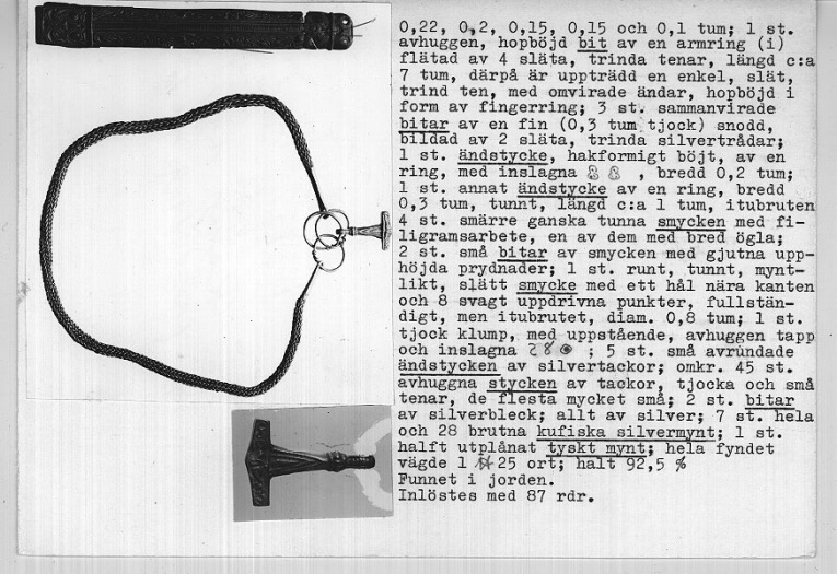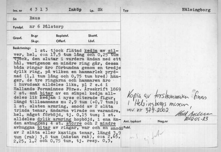 En hammare af silfver (fig. 25) med ett skaft, som tilltager i bredd fram emot sjelfva hammarn. Detta smycke, som hänger i en silfverkedja, hittades år 1870 å egorna till N:o 6 Pålstorp i Raus‘ socken. nordvestra Skåne, jämte fragmenter af andra silfversmycken, 7 hela och 28 brutna kufiska silfvermynt, tillhörande åren 899 -916, ett karolingiskt falskmynt samt ett skadadt och utnött; tyskt kejsaremynt (Inv. 4313). Fyndet kan anses tillhöra det tionde århundradet.