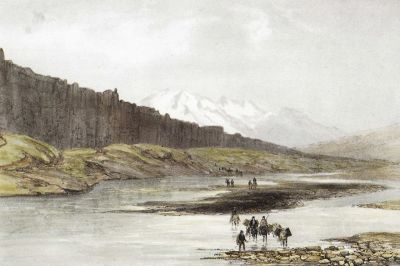 Öxará og Lögberg, Þingvellir. Illustration af A. E. F. Mayer, (1805-1890). Kilde: Íslandsmyndir Mayers 1836.