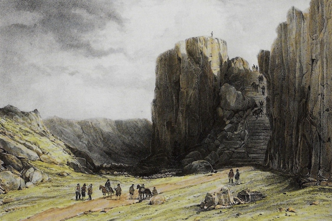 Almannagjá, Þingvellir. Illustration af A. E. F. Mayer, (1805-1890). Kilde: Íslandsmyndir Mayers 1836