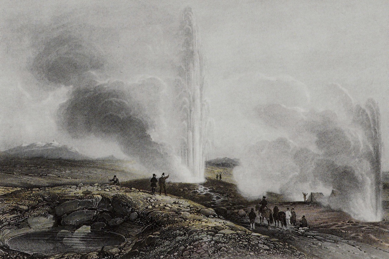 Geysir til venstre og Strokkur til højre. Illustration af A. E. F. Mayer, (1805-1890). Kilde: Íslandsmyndir Mayers 1836