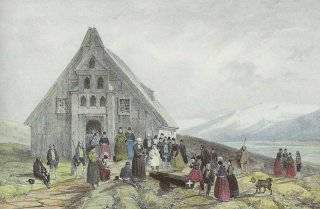 Kirken i Breiðabolstaður. Illustration af A. E. F. Mayer, (1805-1890). Kilde: Íslandsmyndir Mayers 1836 (Billedet her fra 1839)