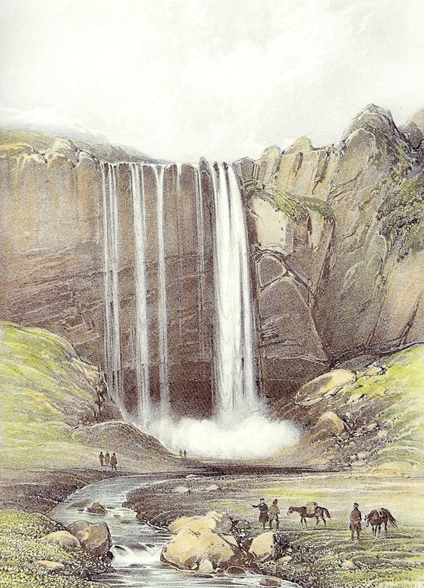 Seljalandsfoss. Illustration af A. E. F. Mayer, (1805-1890). Kilde: Íslandsmyndir Mayers 1836 (Billedet her fra 1839)