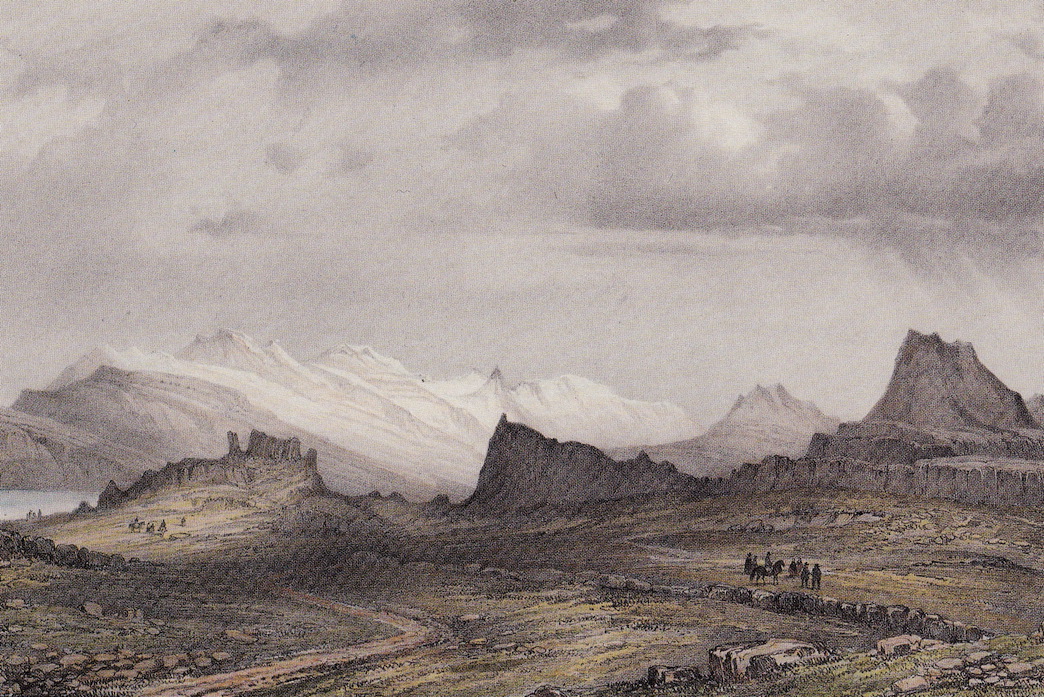 Udsig fra Djúpavog. Hamarsfjord i baggrunden Illustration af A. E. F. Mayer, (1805-1890). Kilde: Íslandsmyndir Mayers 1836