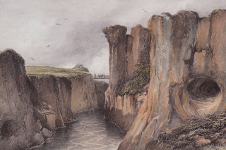 Jökulsá á Brú at Fossvellir. Illustration af A. E. F. Mayer, (1805-1890). Kilde: Íslandsmyndir Mayers 1836