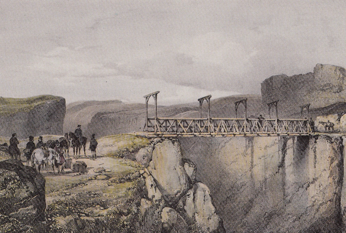 Jökulsá á Brú at Fossvellir. Illustration af A. E. F. Mayer, (1805-1890). Kilde: Íslandsmyndir Mayers 1836