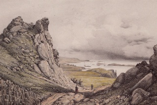 Í Drangaklifi við Drangakletta i Vopnafirði. Illustration af A. E. F. Mayer, (1805-1890). Kilde: Íslandsmyndir Mayers 1836