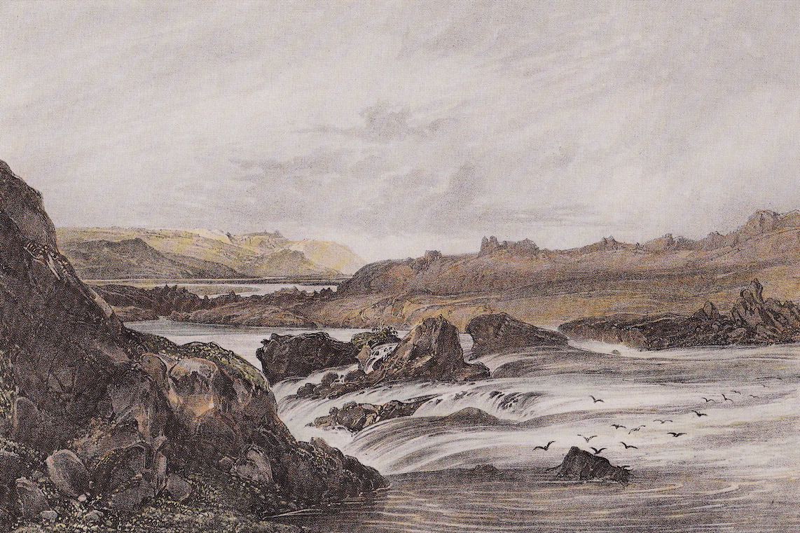 Laxá i Aðaldalur. Illustration af A. E. F. Mayer, (1805-1890). Kilde: Íslandsmyndir Mayers 1836