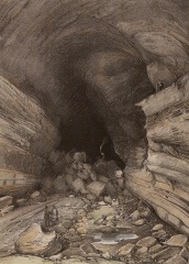 Dybt inde i Surtshellir. Illustration af A. E. F. Mayer, (1805-1890). Kilde: Íslandsmyndir Mayers 1836