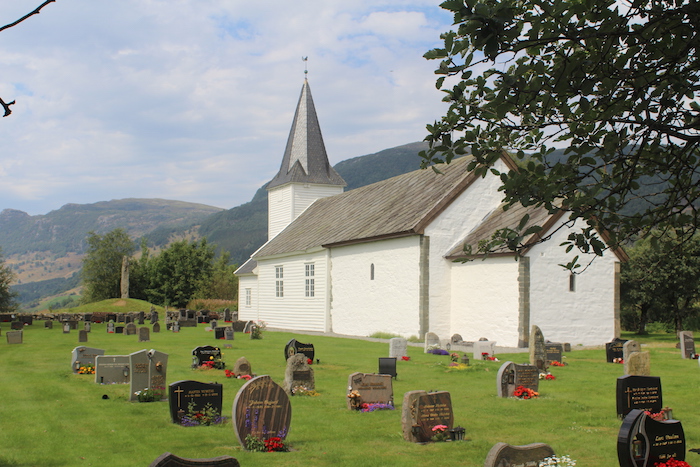 Stødle kyrkja med Kyrjehaugen i bakgrunnen. Etne i Hordaland.